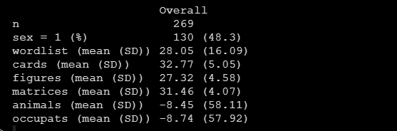 可以看到,sex变量是用频数百分比进行描述的,其余的连续变量都是以均值标准差呈现的。