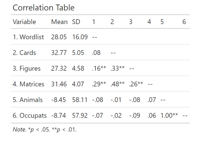 data %>% select(wordlist:occupats) %>% mlmCorrs::corstars()便可以得到结果如下,真的是很方便呀: