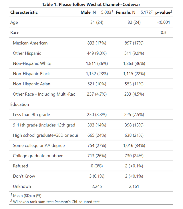 data %>% tbl_summary( by=Gender,statistic = all_continuous() ~ "{mean} ({sd})",) %>% add_p() %>% modify_caption("**Table 1. Please follow Wechat Channel--Codewar**")可以看到,代码基本就1行,add_p是添加分组比较的p值(按需使用),modify_caption是更改表的标题,运行上面的代码,即可得到又一张出版级的表格如下(内容和图3也是一样的):