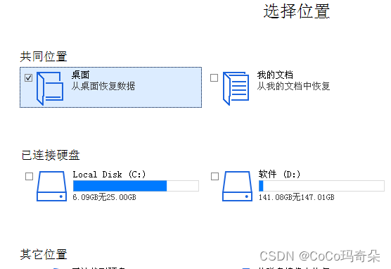 接下来就是一个位置的选择界面,选择你丢失文件的路径。比如你是从桌面直接删除的,可直接将路径选择为桌面。如果你记得文件丢失的具体路径可精确选择位置进行恢复,如果记不得位置就将全部路径勾选出来。之后进行扫描。