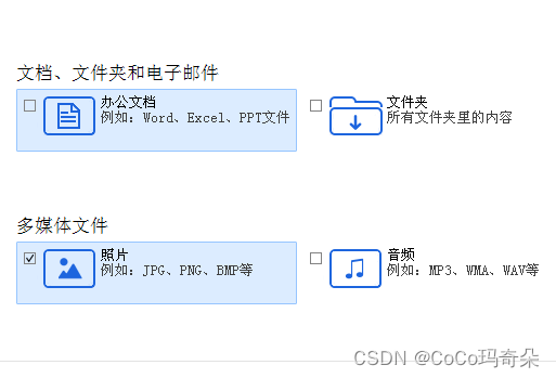 选择要恢复的文件类型,可选择的类目有所有数据、办公文档、文件夹、电子邮件、照片、音频、视频等。比如你要文件恢复的类型是图片类的就勾选照片,点击右下角的“下一个”按键,进入下一个选择页面。