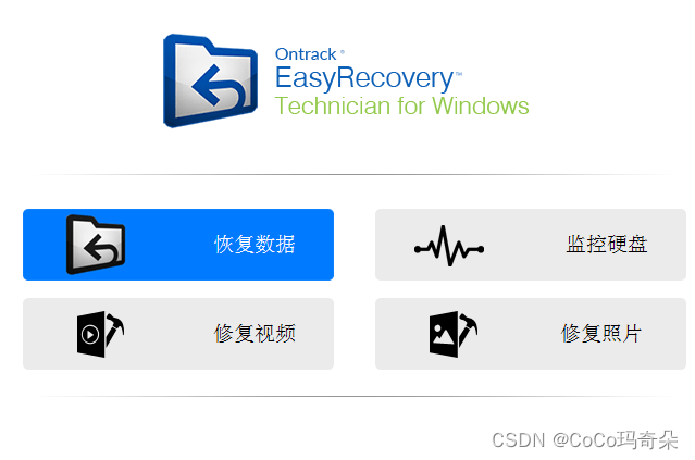 首先我们打开EasyRecovery的界面,其中有四大选项,作为我们日常使用来说直接选第一项恢复数据。单机“恢复数据”以恢复丢失和删除的数据。