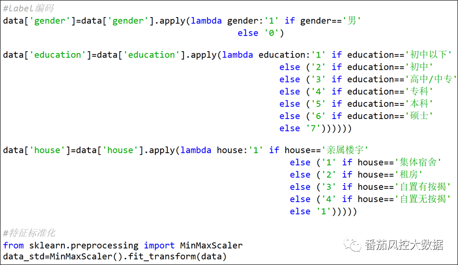 以上关于特征编码与特征标准化的数据处理过程,针对本样本数据案例,具体的实现代码如图4所示,其中特征标准化处理采用了min-max算法。