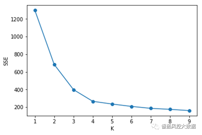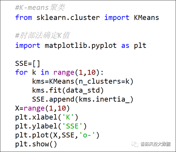 理解了“肘部法”的原理逻辑后,我们来通过代码来实现这个过程,具体代码如图5所示,生成的可视化结果如图6所示,横纵坐标分别为K值与SSE误差平方和。