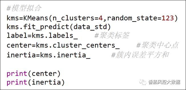 从图5可知,K-means聚类的K值与指标SSE的数据分布关系,非常类似一个“手肘”的形状,且肘部对应的拐点很明显是K=4,说明本案例样本数据如果采用K-means进行聚类,分为4类较为合适。下面我们通过K-mean算法指定4类进行模型训练,并将各聚类簇的标签和种子中心输出,具体代码如图6所示。