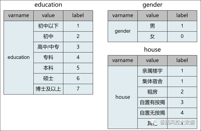在采用K-means聚类算法分析之前,我们需要注意的是,K-means的原理逻辑是以距离作为样本间相似度的度量标准,将距离相近的样本分配到同一个类别。样本间距离的计算方式可以是欧式距离、曼哈顿距离、余弦相似度等,K-means算法通常采用欧氏距离来度量各样本间的距离,而得到距离的前提条件是特征类型必须是数值型。因此,本案例样本中的变量gender、education、house,需要进行特征转换,将字符型转为数值型。由于原特征education、house属于有序分类型变量,这里根据实际业务的信息比较含义,可以采用特征标签编码方式进行数据处理,具体逻辑如图3所示。