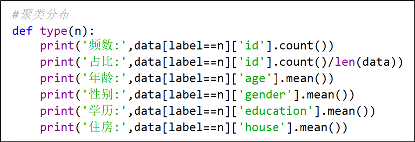 通过图8代码定义输出聚类各簇的频数、占比,以及各特征的样本均值。