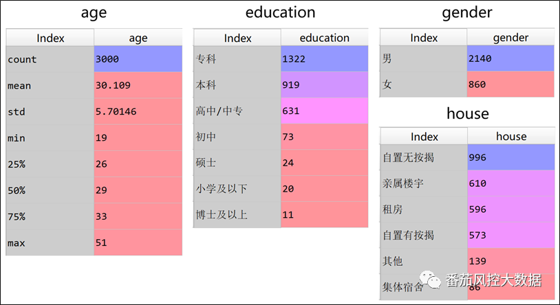 由上图数据样例可知,样本是没有Y字段的,我们需要根据特征age、gender、education、house的分布特点来进行客户分群,我们通过代码来输出各字段的取值分布,具体如图2所示。