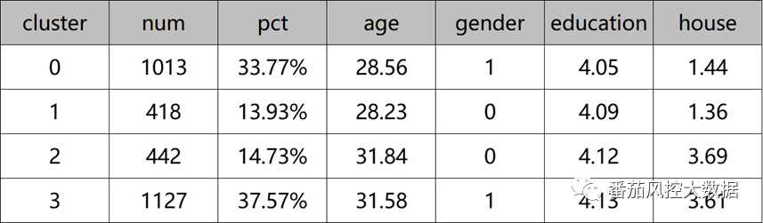 从客群画像描述可知,各客群的学历程度基本相当;从年龄或住房类型角度看,客群1、2与客群3、4分别可以归为一类;从性别角度看,客群1、4与客群2、3分别可以归为一类。在聚类分析的4个变量中,house(住房类型)是可以最直接体现出客户资产能力的特征,因此客群3、4具有很高的营销价值。此外,从age(年龄)分布也可以看出,这类客群的稳定性相比客群1、2要表现较好。