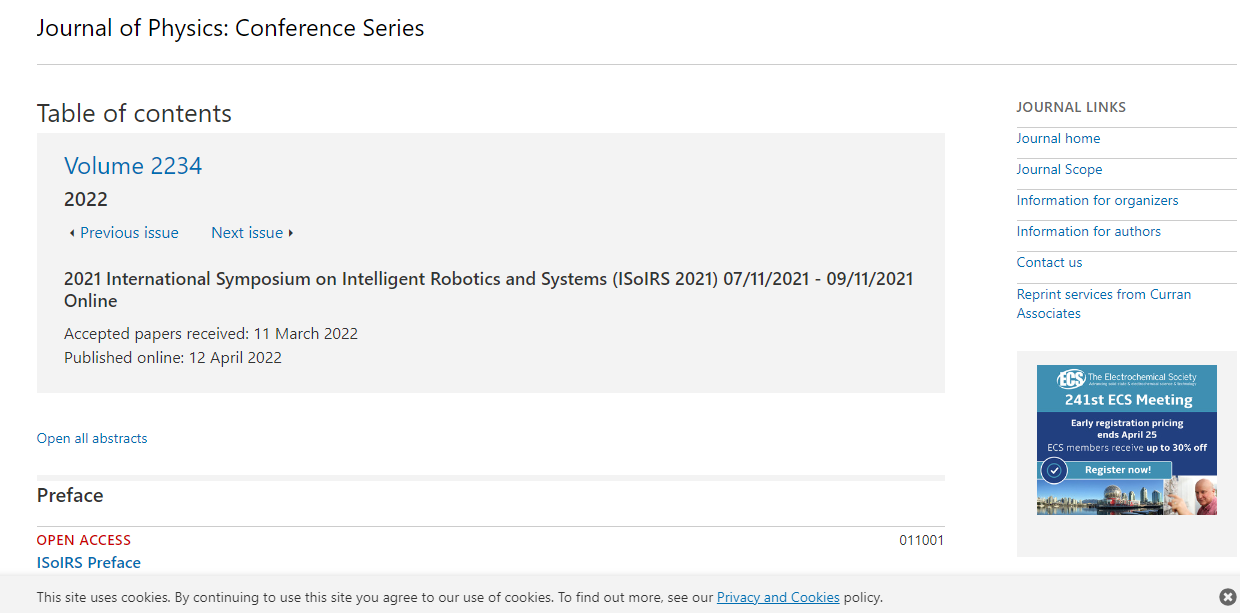 ISOIRS 2021出版Journal of Physics: Conference Series(JPCS),已成功EI、SCOPUS检索!