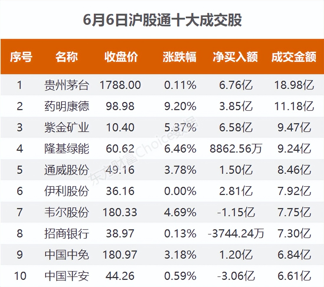 交易所公布的沪深港通十大成交股显示,北上资金大幅净买入贵州茅台6.76亿元,净买入紫金矿业6.58亿元,净买入药明康德3.85亿元,同时大幅净卖出万科A4.13亿元。