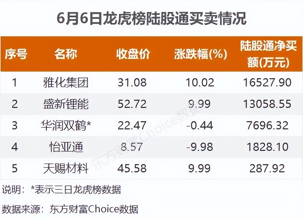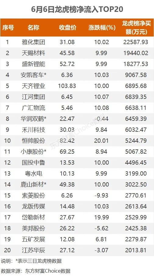 6月6日,上榜龙虎榜个股中,资金净流入最多的是雅化集团,为2.26亿元。数据显示,该股日内涨停收盘,全天换手率8.69%。资金净流入居前的深股通席位净买入1.65亿元。