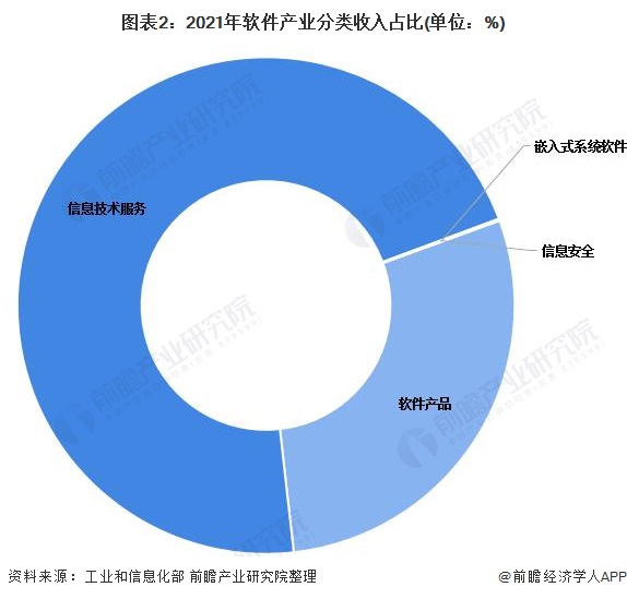 分领域来看,2021年,软件产品收入24433亿元,同比增长12.3%,增速较2020年同期提高2.2个百分点,占全行业收入比重为25.7%;信息技术服务收入60312亿元,同比增长20.0%,高出全行业水平2.3个百分点,占全行业收入比重为63.5%;信息安全产品和服务收入1825亿元,同比增长13.0%,增速较2020年同期提高3个百分点;嵌入式系统软件收入8425亿元,同比增长19.0%,增速较2020年同期提高7个百分点。嵌入式软件已经成为产品和装备数字化改造、各领域智能化增值的关键性带动技术。