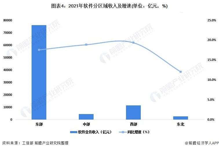 2021年,东部、中部、西部和东北地区分别完成软件业务收入76164亿元、4618亿元、11586亿元和2627亿元,分别同比增长17.6%、18.9%、19.4%和12.1%。其中,中部、西部地区高出全国平均水平1.2、1.7个百分点。四个地区软件业务收入在全国总收入中的占比分别为80.2%、4.9%、12.2%和2.8%。