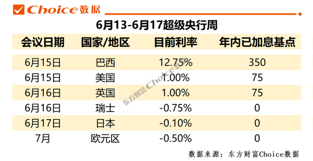 而英国4月通胀率已飙升至9%,民众生活成本危机加剧,市场关注英国央行本次是否单次加息50个基点。此外,巴西央行、瑞士央行本周都将召开重要会议。