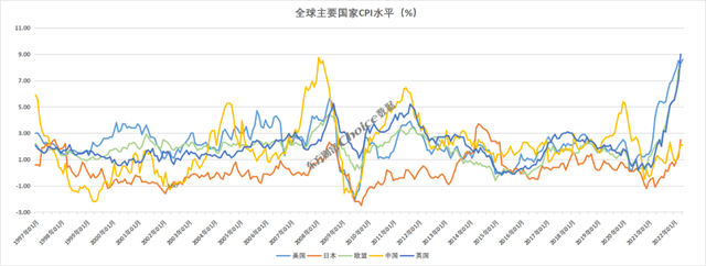 Choice数据统计,2021年以来,全球主要经济体CPI指数触底反弹,截至目前,美国、欧盟CPI同比涨幅均超过8%,英国4月CPI已达到9%。