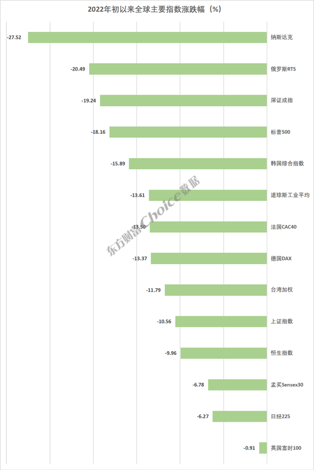通胀数据续创新高,“超级央行周”来袭,全球加息预期升温使资本市场笼罩阴影,6月10日欧美股市收盘大跌。而自年初以来,截至6月13日,全球主要股票指数悉数回落。其中,纳斯达克指数跌幅达到27.52%;俄罗斯RTS下跌20.49%;深圳成指、标普500、韩国综合指数、德国DAX等跌幅超过10%。