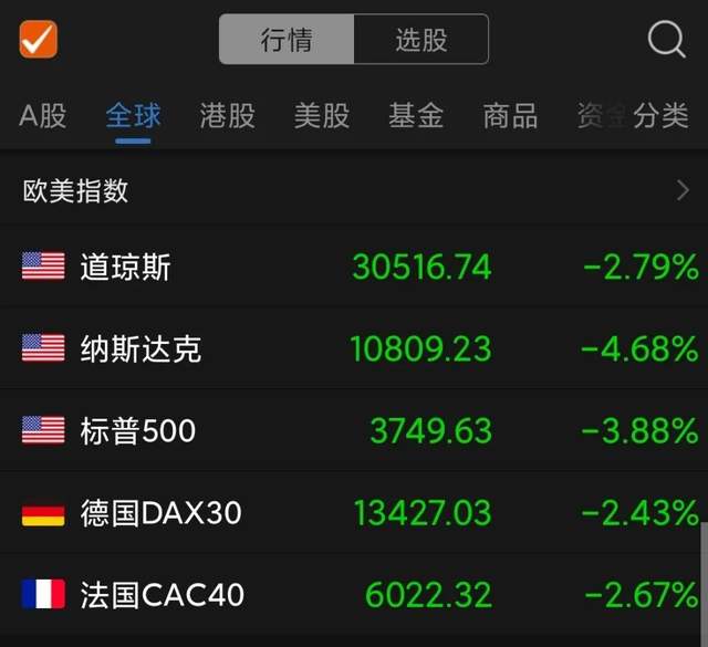 受通胀水平大超预期和加息预期升温影响,6月13日欧美股市延续前一日大跌走势,再遭重挫。道琼斯指数跌近900点,纳斯达克指数暴跌4.68%,德国DAX30、法国CAC40跌超2%。