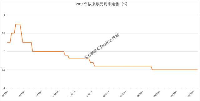 Choice数据统计,2012年7月,欧洲央行将存款机制利率下调至0%,自此,欧洲央行一直实行量化宽松货币政策。2014年6月,欧洲央行继续将利率下调至-0.1%,欧元区正式步入负利率阶段,随后经央行多次降息,存款机制利率目前维持在-0.5%。
