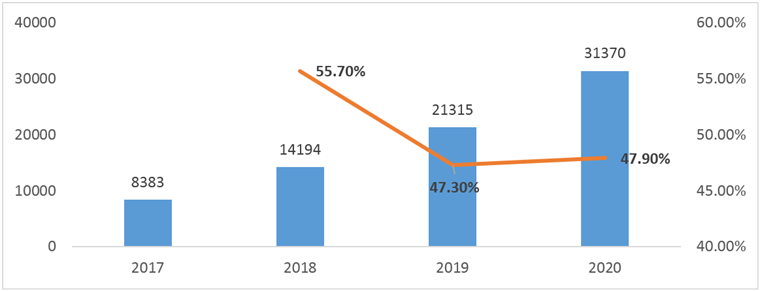 2017-2020年中国工业互联网产业经济总体规模及增长情况(单位:亿元,%)