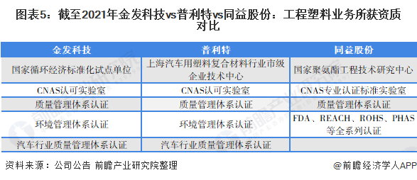 金发科技、普利特、同益股份均获得质量管理体系认证以及CNAS实验室认可。此外,金发科技为国家循环经济标准化试点单位;普利特为上海汽车用塑料复合材料行业市级企业技术中心;同益股份为国家聚氨酯工程技术研究中心。