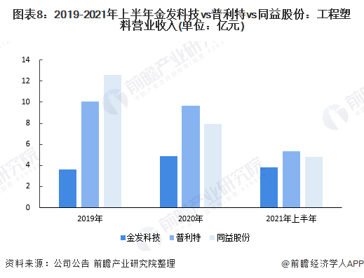 从工程塑料业务收入来看,同益股份工程塑料业务营收规模最大。2021年上半年,普利特、同益股份工程塑料业务营收分别达5.37亿元与4.8亿元。