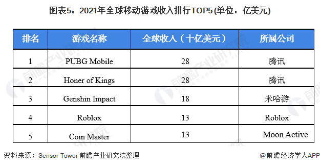 根据Sensor Tower数据,2021年在全球 App Store 和 Google Play市场中,腾讯的《PUBG Mobile》和王者荣耀全球收入均到达了28亿美元,较2020年分别增长9%和14.7%。米哈游的《原神》则位列第三位,年收入为18亿美元。《Roblox》和《Coin Master》分别位列第四和第五位。2021年,全球前5大移动游戏的市场集中度接近11%,市场整体较为分散。