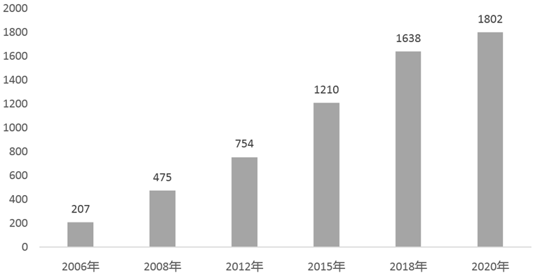 2006-2020年中国物流园区数量规模变化情况(单位:家)