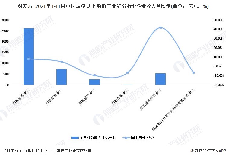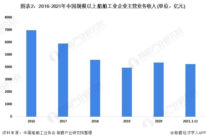 2021年1-11月,全国规模以上船舶工业企业1093家,实现主营业务收入4252.2亿元,同比增长9.6%。