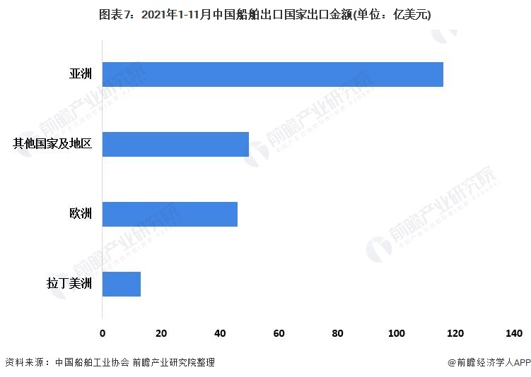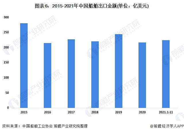 2021年1-11月,我国船舶出口金额224.7亿美元,同比增长18.6%。