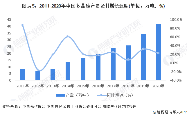 我国多晶硅产业2005年以来在政策推动下起步,一路历经产能过剩、淘汰兼并,行业集中度不断提高。部分先进企业的生产成本已达全球领先水平,产品质量多数在太阳能级一级品水平。据中国光伏协会统计数据显示,2012年以来,我国多晶硅产量持续增长,2020年,全国多晶硅产量为41.95万吨,同比增长22.7%。