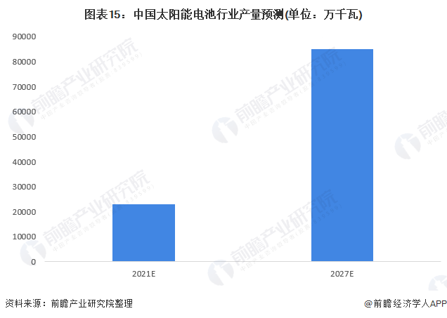 前瞻认为2021年我国太阳能电池行业产量将随着碳中和碳达峰政略的落实以及全球对环保能源需求的快速增加,从而继续保持高增长,行业产量将突破23000万千瓦。在随后的几年,我国太阳能电池行业虽然将受国家补贴下滑的负面影响,但由于整体绿色能源市场需求潜力巨大,因此太阳能电池需求仍将快速增长,而更多的则是行业内部的兼并重组,企业通过这一形式获取规模收益。前瞻预计2027年,我国太阳能电池产量将达到85000万千瓦,年复合增速约30%。