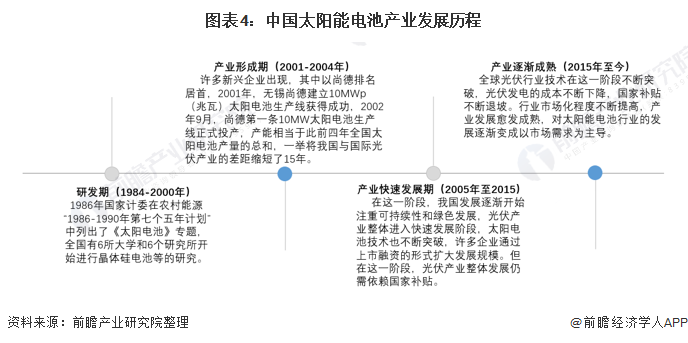 我国太阳能电池行业发展大致经历了四个阶段,目前我国太阳能电池行业随着光伏行业整体技术的不断成熟,国家补贴的不断滑坡,行业发展逐渐进入成熟阶段,行业发展从过去依赖国家补贴逐渐向以市场需求为主导转变,企业通过规模化,产业化发展,整合行业,从而获取超额收益。