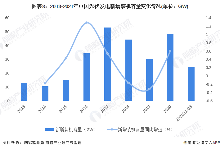 我国太阳能光伏行业虽起步较晚,但发展迅速,尤其是2013年以来,在国家及各地区的政策驱动下,太阳能光伏发电在我国呈现爆发式增长,据国家能源局统计数据显示,2017年,我国光伏发电新增装机容量为53.06GW,创历史新高,2018年,受光伏531新政影响,各地光伏发电新增项目有所下滑,全年新增装机容量为44.26GW,同比下降16.6%。受国家光伏行业补贴、金融扶持等政策影响,2020年光伏装机量大幅回升,2020年,全国光伏发电新增装机48.20GW,同比增长59.5%。