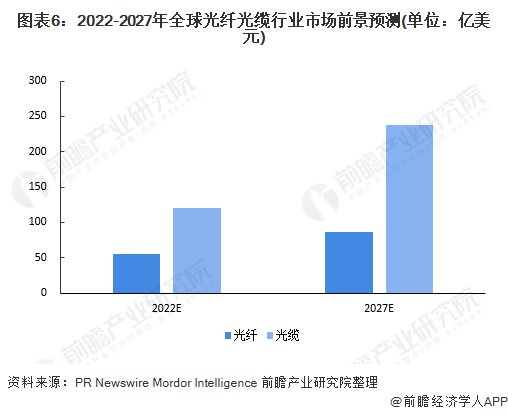 受到物联网(IoT)和云服务需求的增加以及基于光纤的互联网连接利用率提高的推动,企业正在从传统的有线互联网线路过渡到光纤连接,有望在不久的将来推动市场的收入增长。根据PR Newswire预计,2022年,全球光纤市场价值为54.6亿美元,至2027年市场价值上升至86.9亿美元。