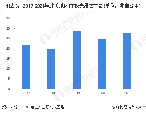 根据CRU公布的全球各区域对FTTx(光纤到某地)的相关需求数据,2017-2019年,北美地区FTTx光缆需求量呈上升趋势,2020年因受疫情影响需求量下降,初步统计,2021年,北美地区FTTx光缆需求量上升至2019年水平,达28兆赫公里。