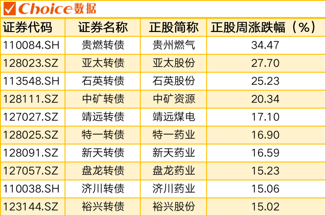对应正股行情,表现最佳的前五名分别是贵州燃气、亚太股份、石英股份、中矿资源、靖远煤电,最高周涨跌幅达34.47%。