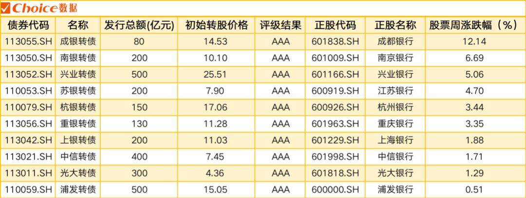 从对应正股近5个交易日表现来看, 表现较好的前三名股票分别是成都银行、南京银行、兴业银行,周涨跌幅分别为12.14%、6.69%、5.06%。