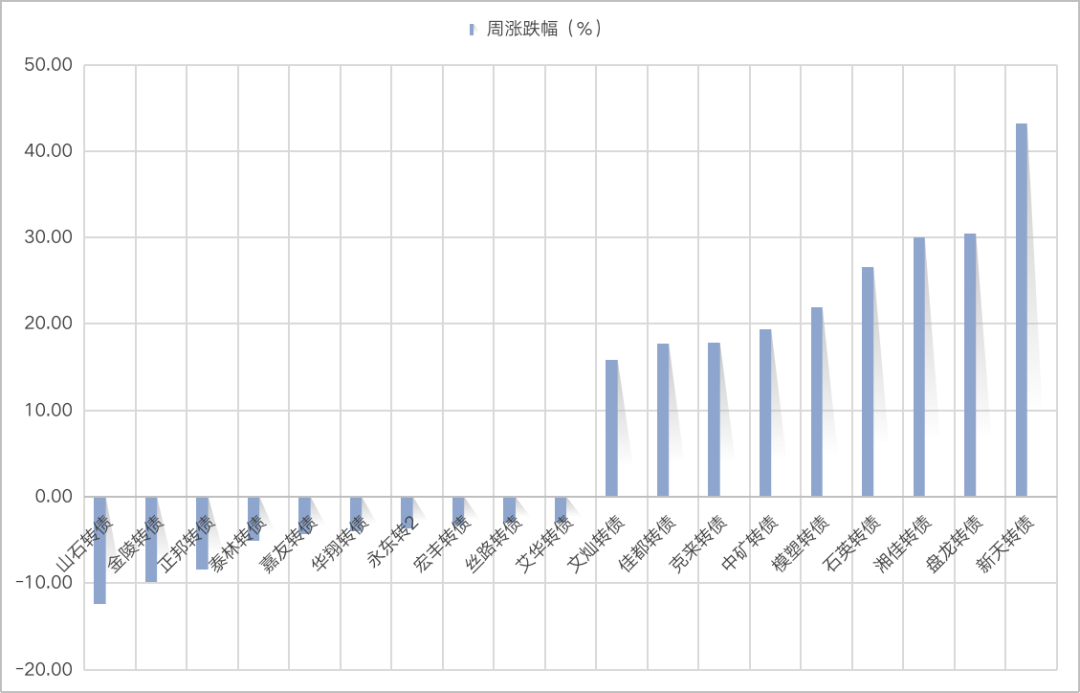 从最新行情数据分析,近5个交易日涨幅居前的可转债主要包括新天转债(43.15%)、盘龙转债(30.43%)、湘佳转债(30.00%);跌幅居前的主要包括山石转债(-12.40%)、金陵转债(-9.91%)、正邦转债(-8.40%)。