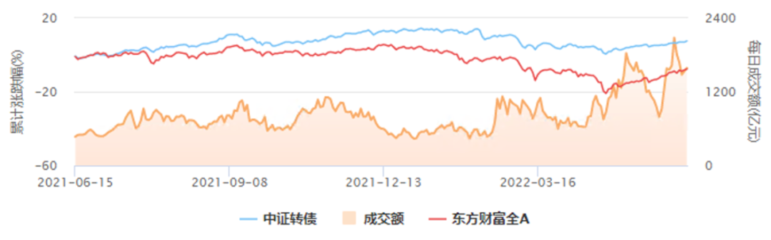 同期,中证转债指数累计跌幅5.61%,同期上证指数累计跌幅9.74%,深证成指累计跌幅18.22%,创业板指累计跌幅22.19%。中证转债指数在跑赢了三大主要股指的同时,近一年来涨跌幅也始终居于东方财富全A指数之上,抗跌属性明显。