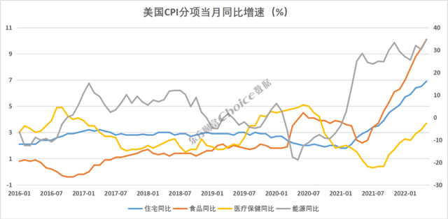 Choice数据统计,2020年3月开始,能源价格大涨;但因此时住宅、食品、医疗保健服务同比下滑,因此CPI同比并未上行。直至2021年住宅、食品、医疗保健服务三大分项先后攀升,最终推动CPI大幅攀升。