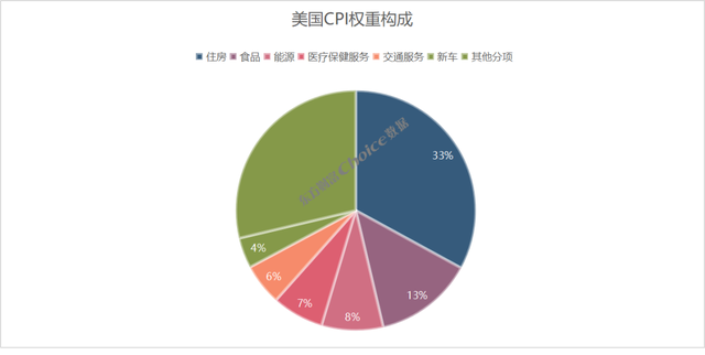 在美国CPI权重构成中,住房分项占到33%,食品和能源分享合计占到21%,医疗保健服务占比7%。