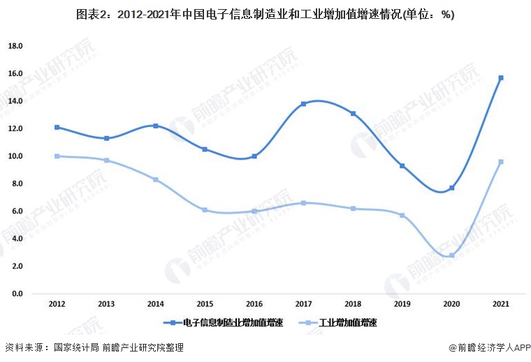 2021年,全国规模以上电子信息制造业增加值比上年增长15.7%,在41个大类行业中,排名第6,增速创下近十年新高,较2020年加快8.0个百分点;增速比同期规模以上工业增加值增速高6.1个百分点,差距较2020年有所扩大,但较高技术制造业增加值增速低2.5个百分点;两年平均增长11.6%,比工业增加值两年平均增速高5.5个百分点,对工业生产拉动作用明显。
