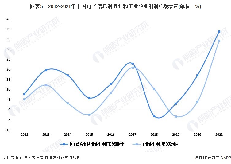2021年,规模以上电子信息制造业实现利润总额8283亿元,比2020年增长38.9%,两年平均增长27.6%,增速较规模以上工业企业利润高4.6个百分点,但较高技术制造业利润低9.5个百分点。营业收入利润率为5.9%,比2020年提高1个百分点,但较规模以上工业企业营业收入利润率低0.9个百分点。