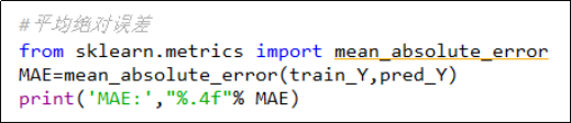 MAE(Mean Absolute Error):平均绝对误差,是绝对误差的平均值,可以更好地反映预测值误差的实际情况。MAE取值越小,说明模型的准确度越高。MAE原理计算公式如下,Python代码实现如图7所示。