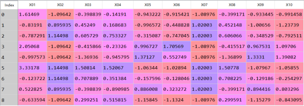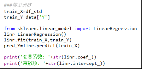我们选取回归算法中最常用的线性回归LinearRegression来训练模型,为了避免各特征的取值量纲对模型拟合的影响,现将建模数据进行z-score标准化处理,实现代码与结果输出分别如图3、图4所示。