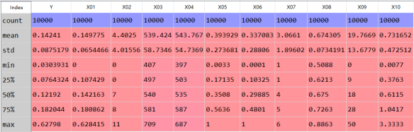 针对建模样本数据,简单描述性统计分析结果如图2所示,可知样本各变量字段均为数值型特征,且不存在缺失值情况。其中,目标变量Y字段为float型,取值范围为[0.0303931, 0.62798),符合回归模型目标变量的取值类型要求。