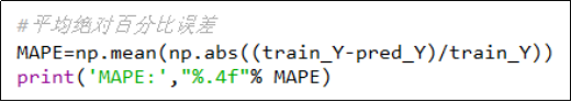 MAPE(Mean Absolute Percentage Error):平均绝对百分比误差,相比MAE指标多了分母yi。MAPE取值越小,说明模型的准确度越高。MAPE原理计算公式如下,Python代码实现如图8所示。