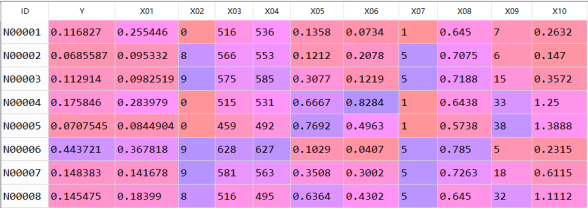 1、业务场景介绍某商业银行根据存量数据拟开发一个额度授信模型,对于申请进件用户,首先会预设一个相同的初始额度amount,然后通过分析用户的资质与风险情况,得到每个用户的具体额度系数n,则用户最终的授信额度为amount*n。案例数据包含10000条样本与20个特征,样例如图2所示,其中ID为样本主键,Y为目标变量(额度系数),X01~X20为特征变量。由于目标变量为连续型特征,因此模型类型为回归问题,可以通过回归模型算法实现,常见的例如线性回归、随机森林、XGBoost、KNN等。