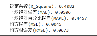 根据以上各指标的原理逻辑与实现代码,将本文案例场景的回归模型指标进行输出,结果如图12所示,可知模型决定系数R_Square>0.4,模型拟合效果较好,且其余误差类指标均较小,模型的准确度较高。